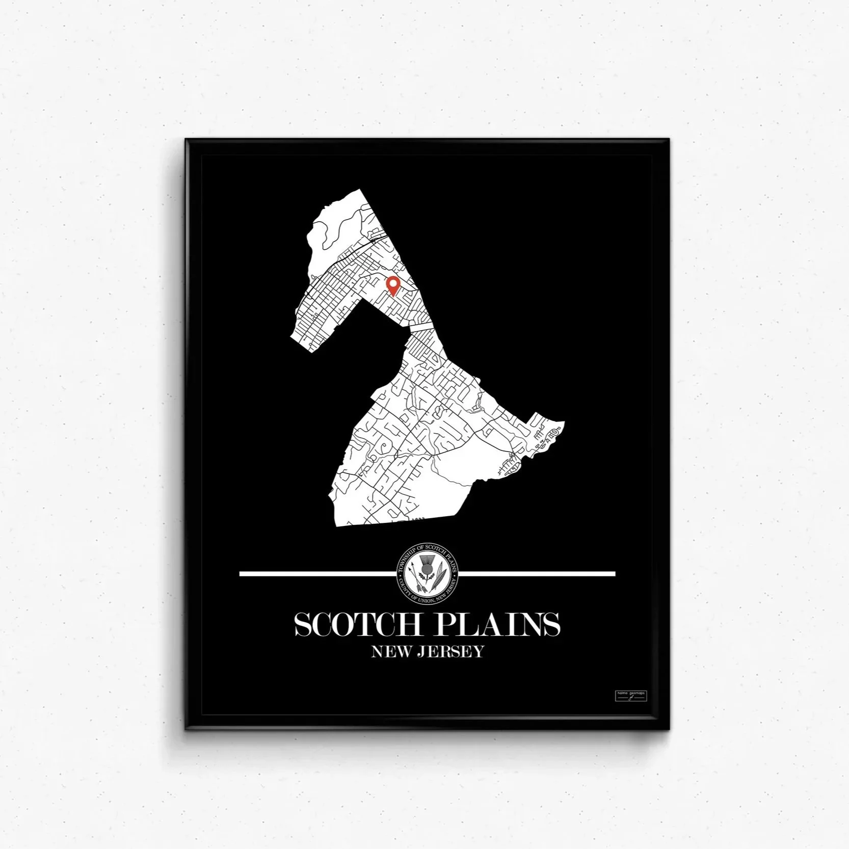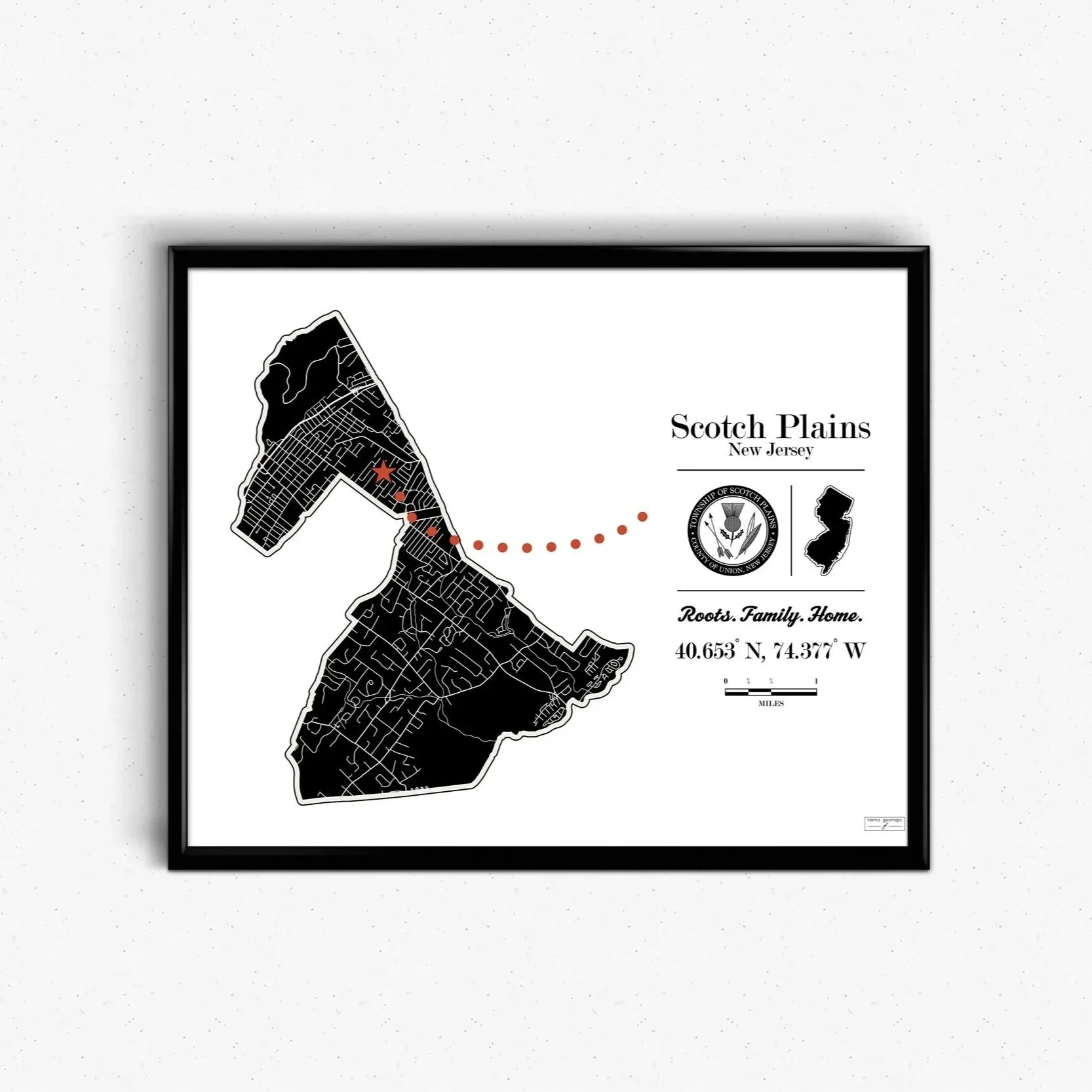 A custom map made for Scotch Plains, NJ, which features the township’s vector logo and a red pin marking a home address.