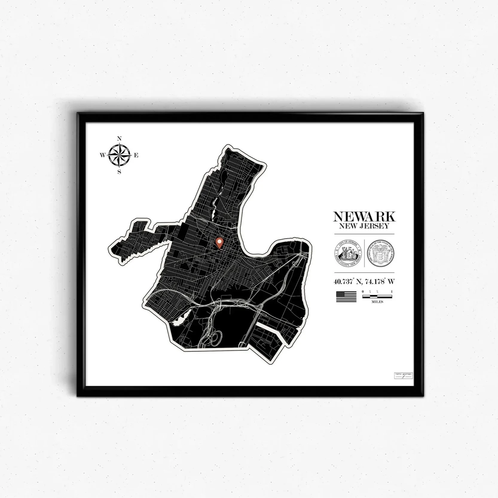 A custom map made for Newark, NJ, which features a red pin marking the location of the Federal Courthouse. It also features the logo for the City of Newark, a state outline of New Jersey, longitudinal coordinates, an American flag, a map scale, and a map compass.