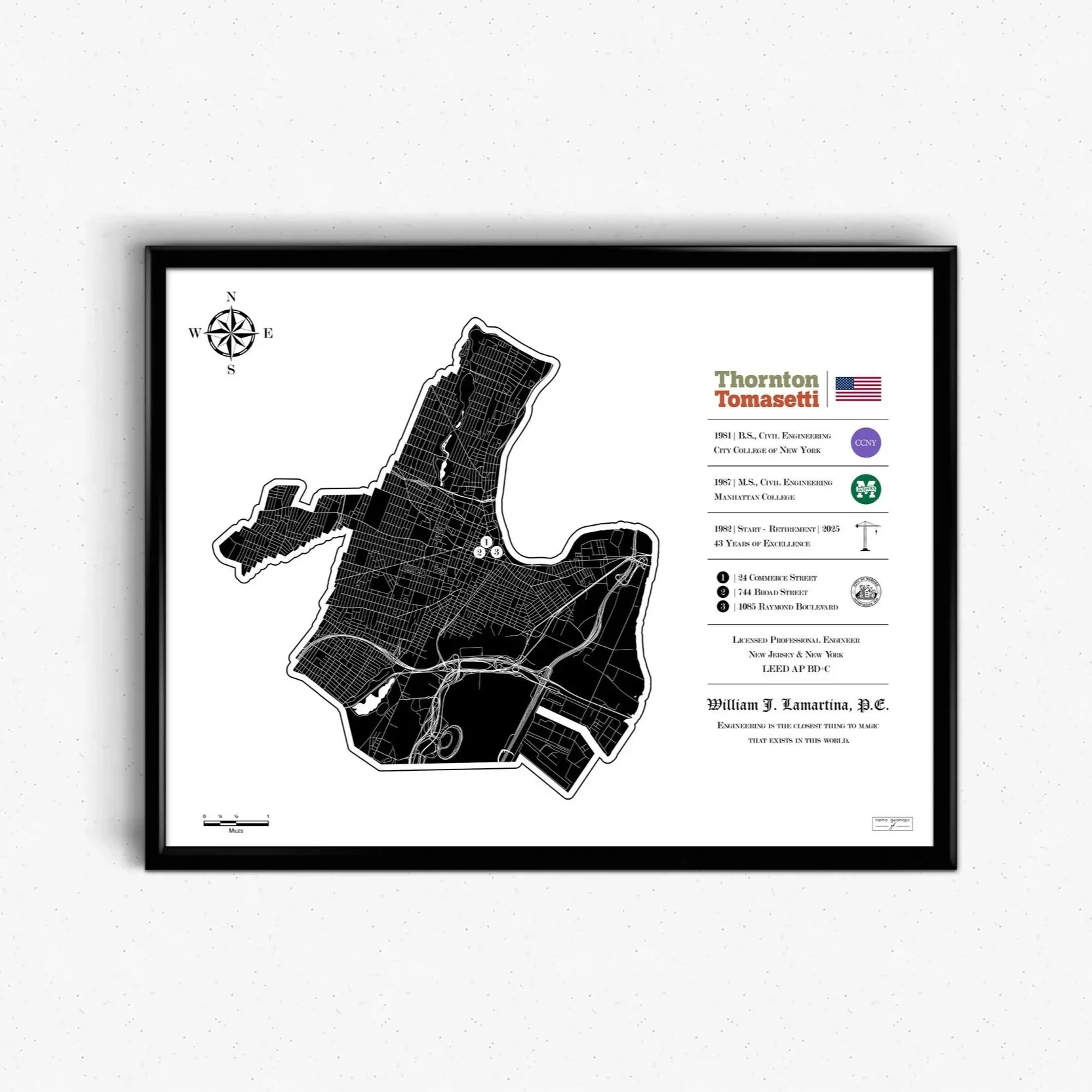 A custom map made for a retired engineer from Thornton Tomasetti in Newark, NJ. The map features career achievements, pinned office locations, the City of Newark logo, a full-color American flag, the Thornton Tomasetti logo, years of service, the Rutgers University logo with degree years, a crane illustration, a map compass, and a map scale.