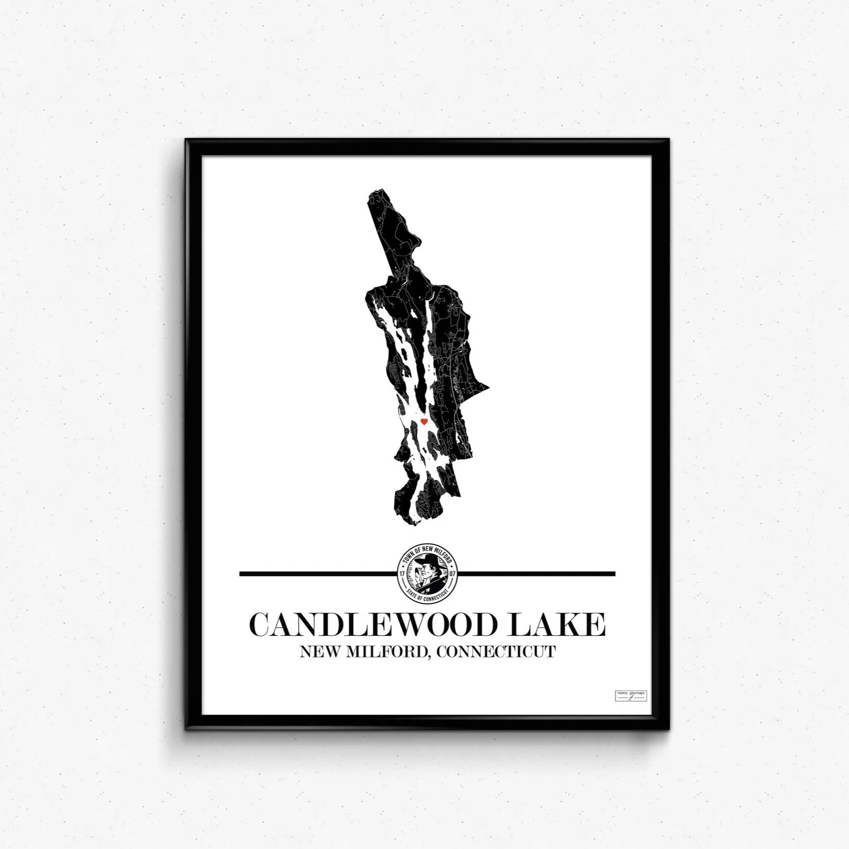 A custom map made for New Milford, CT, which features a red heart-shaped pin marking a lake house address, the township logo, and Candlewood Lake.