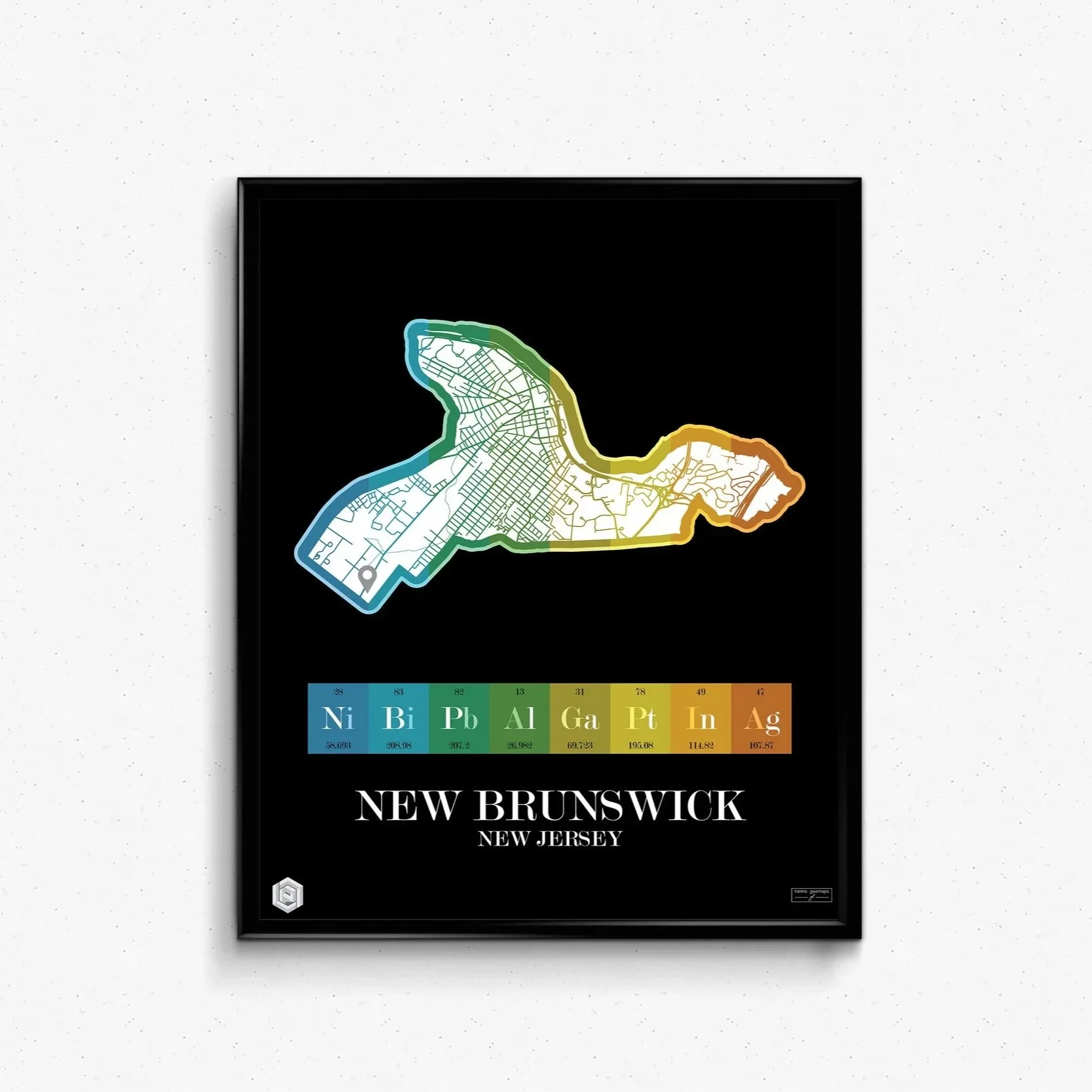 A custom map made for NB Plating in New Brunswick, NJ, which features colorful periodic table vector elements spelling out the company name and the official company logo in the lower-left corner.