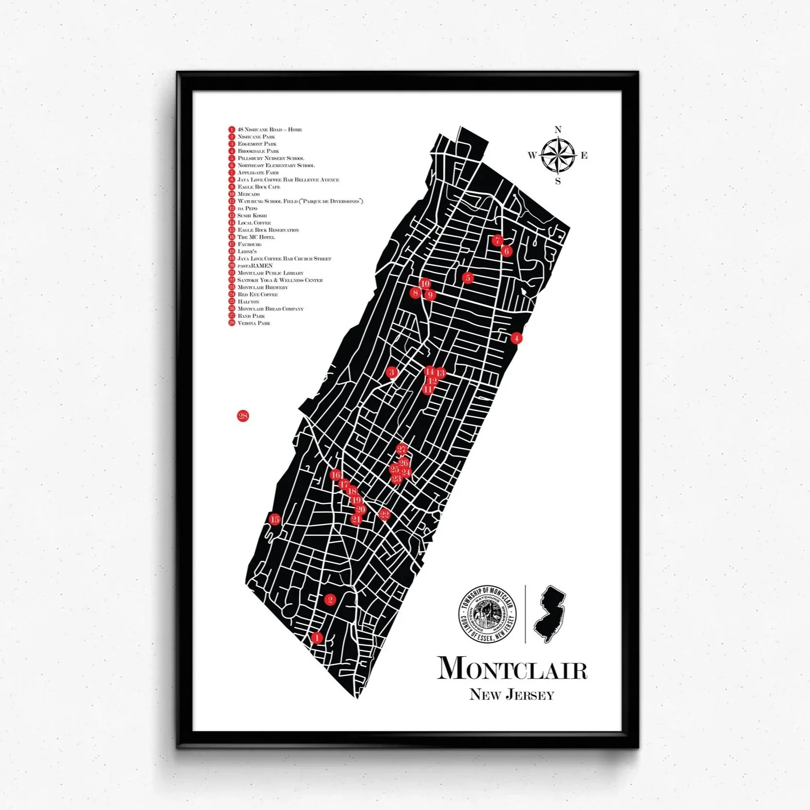 A custom map made for Montclair, NJ, which features multiple points of interest marked with numbered red dots, a legend describing each location, a direction symbol, the New Jersey state outline, and the Montclair city logo.