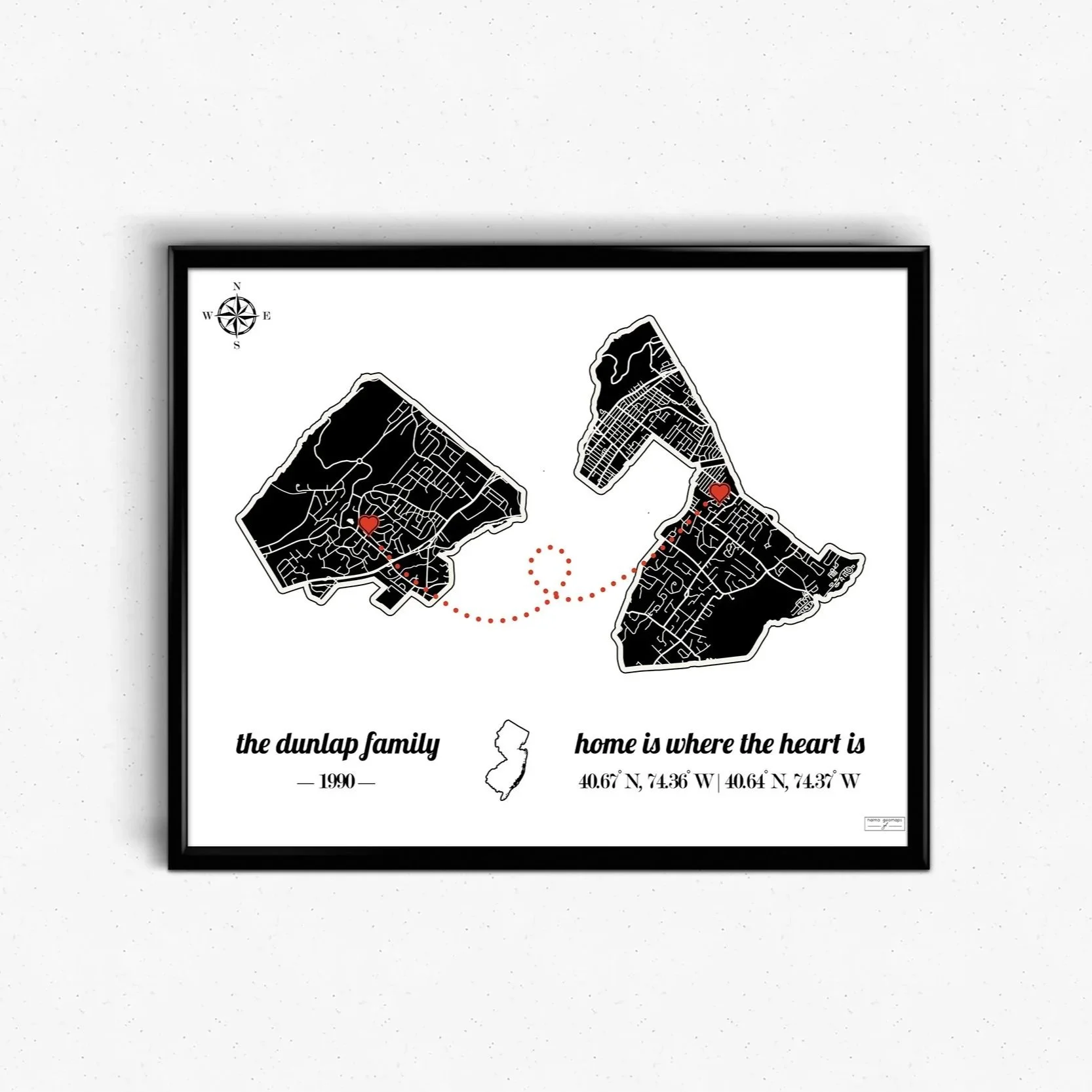 A custom map made for Scotch Plains, NJ, and Mountainside, NJ, which features red heart-shaped pins marking home addresses connected by a dotted line, a family name, a significant date, the New Jersey state outline, a custom phrase, and longitudinal coordinates for both locations.