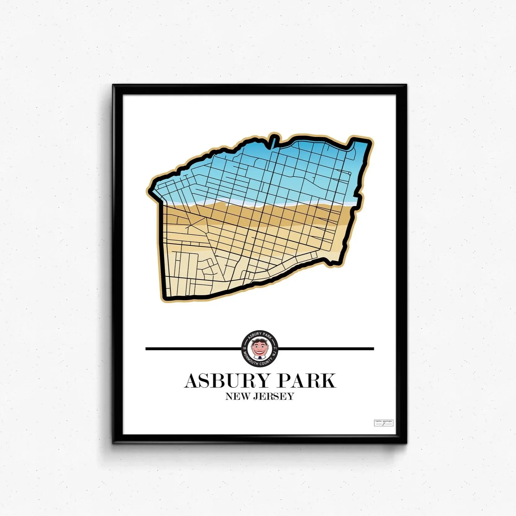 A custom map made for Asbury Park, NJ, which features a vector illustration of the beach in the background and a color logo of Asbury Park’s official mascot, Tillie.