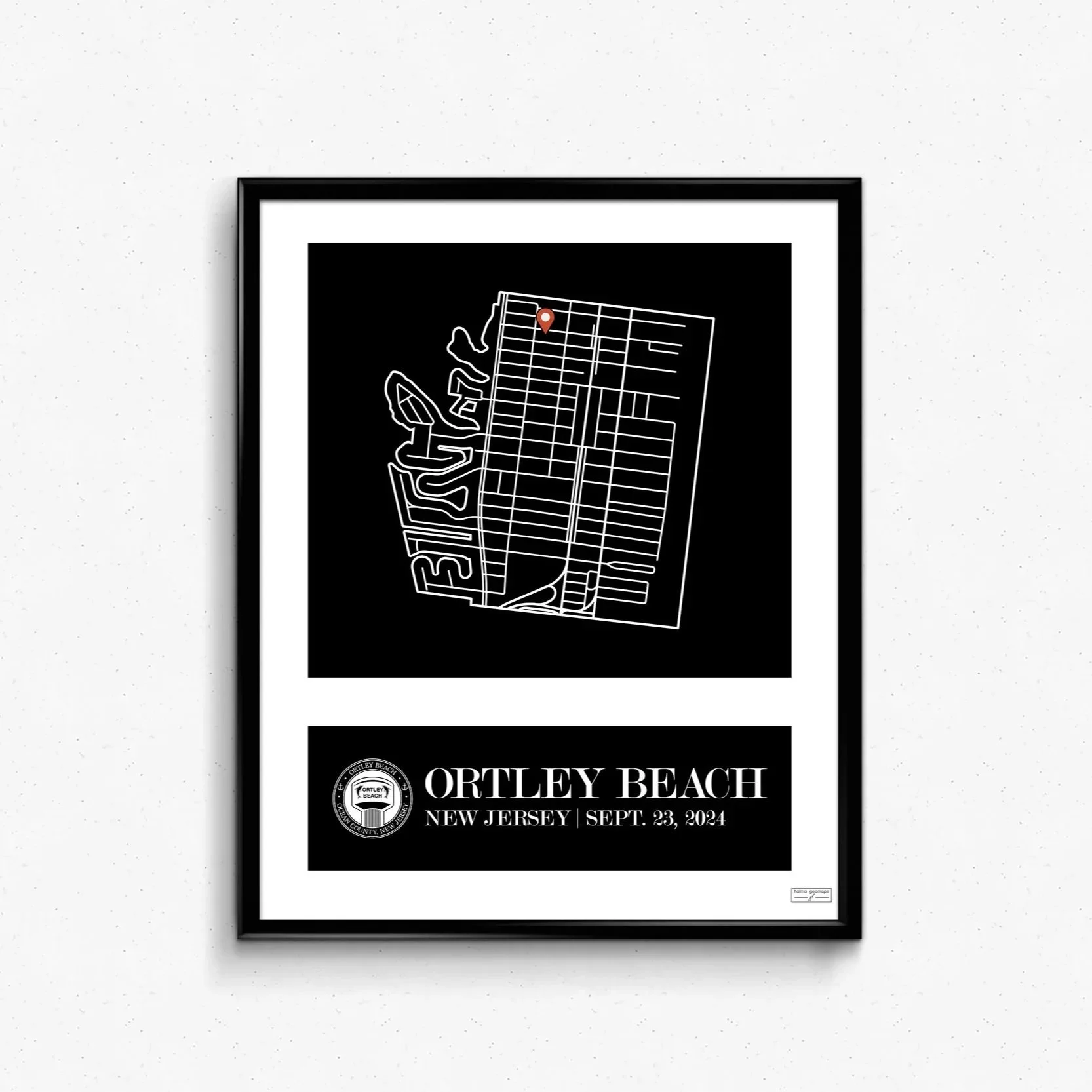A custom map made for Ortley Beach, NJ, which features a red pin marking a home address, the move-in date, and the town’s vector logo.