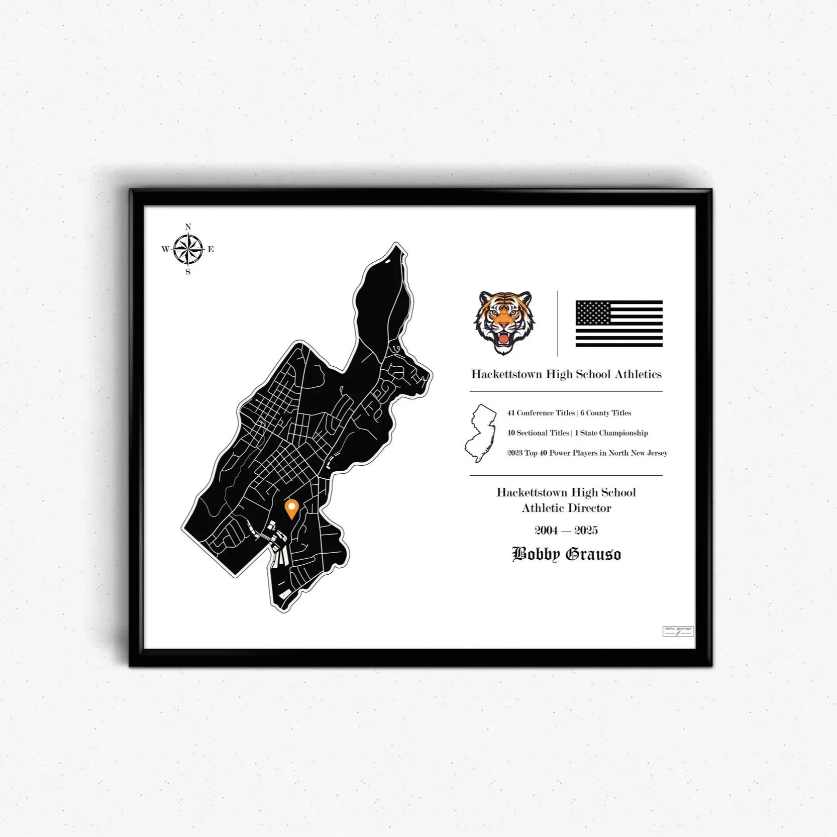 A custom map made for a retired athletic director from Hackettstown High School in Hackettstown, NJ. The map features athletic program achievements from his tenure, a pin marking the high school’s location, a custom tiger mascot logo with an American flag, the New Jersey state outline, years of service, and a map compass.