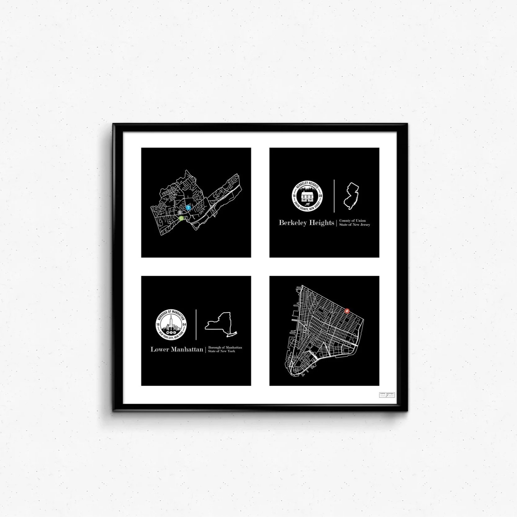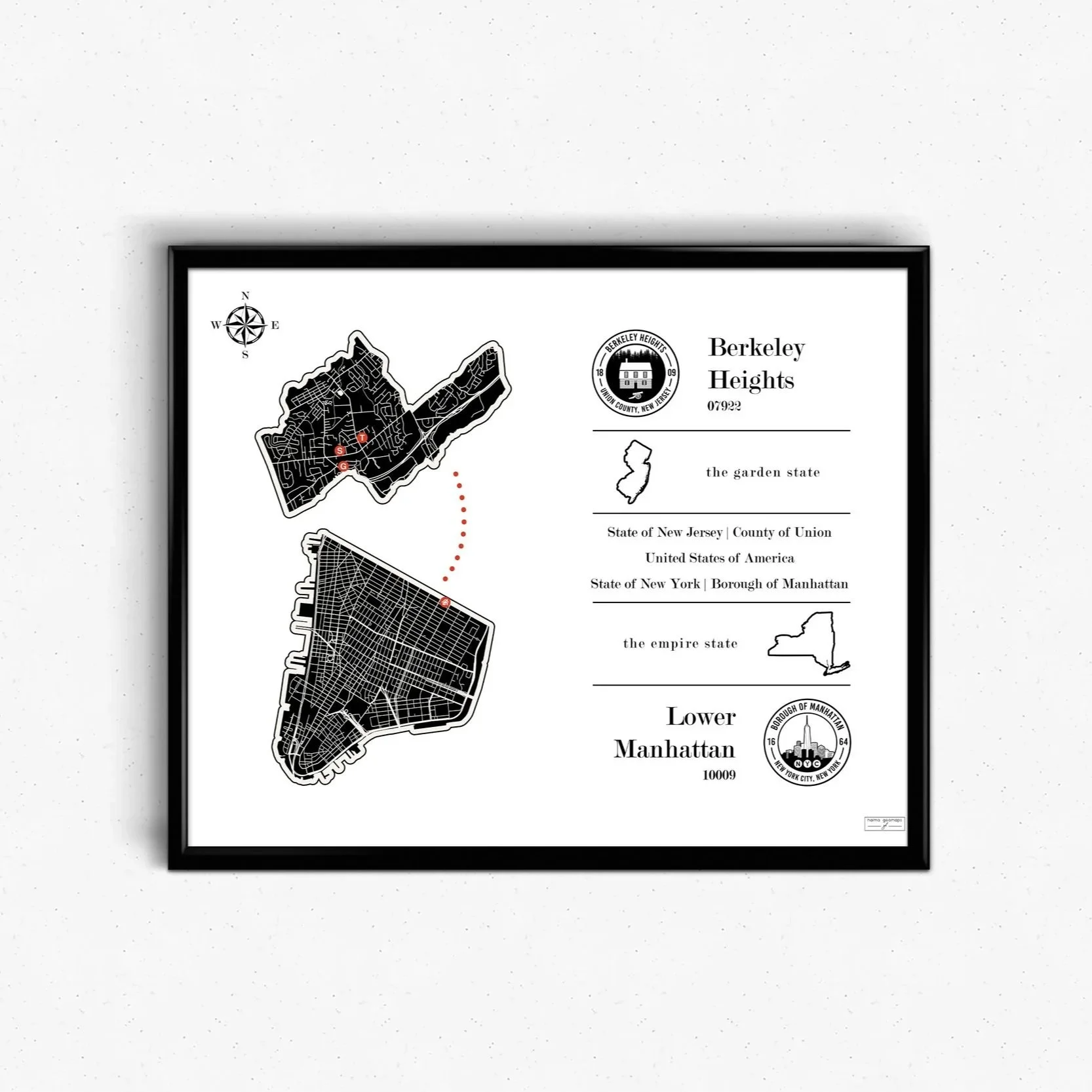 A custom map made for three roommates living in New York City who grew up together in Berkeley Heights, NJ. The map features pins marking their former home addresses in Berkeley Heights and their shared apartment in Lower Manhattan, custom vector logos for both locations, and state outlines of New York and New Jersey.
