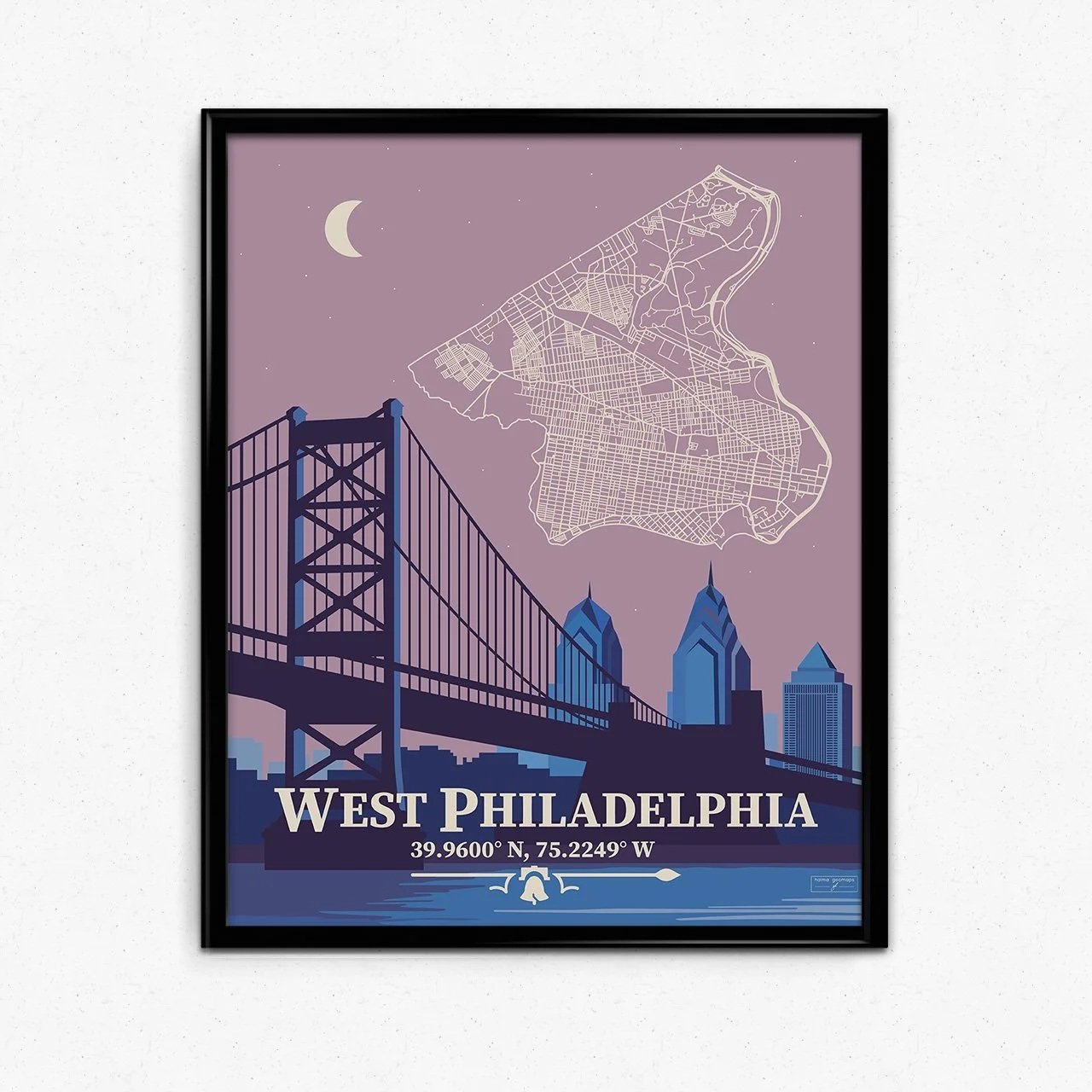 A custom map made for a West Philadelphia resident, which features a vector illustration of the Philadelphia skyline, the longitudinal coordinates of West Philadelphia, and a vector graphic of the Liberty Bell.