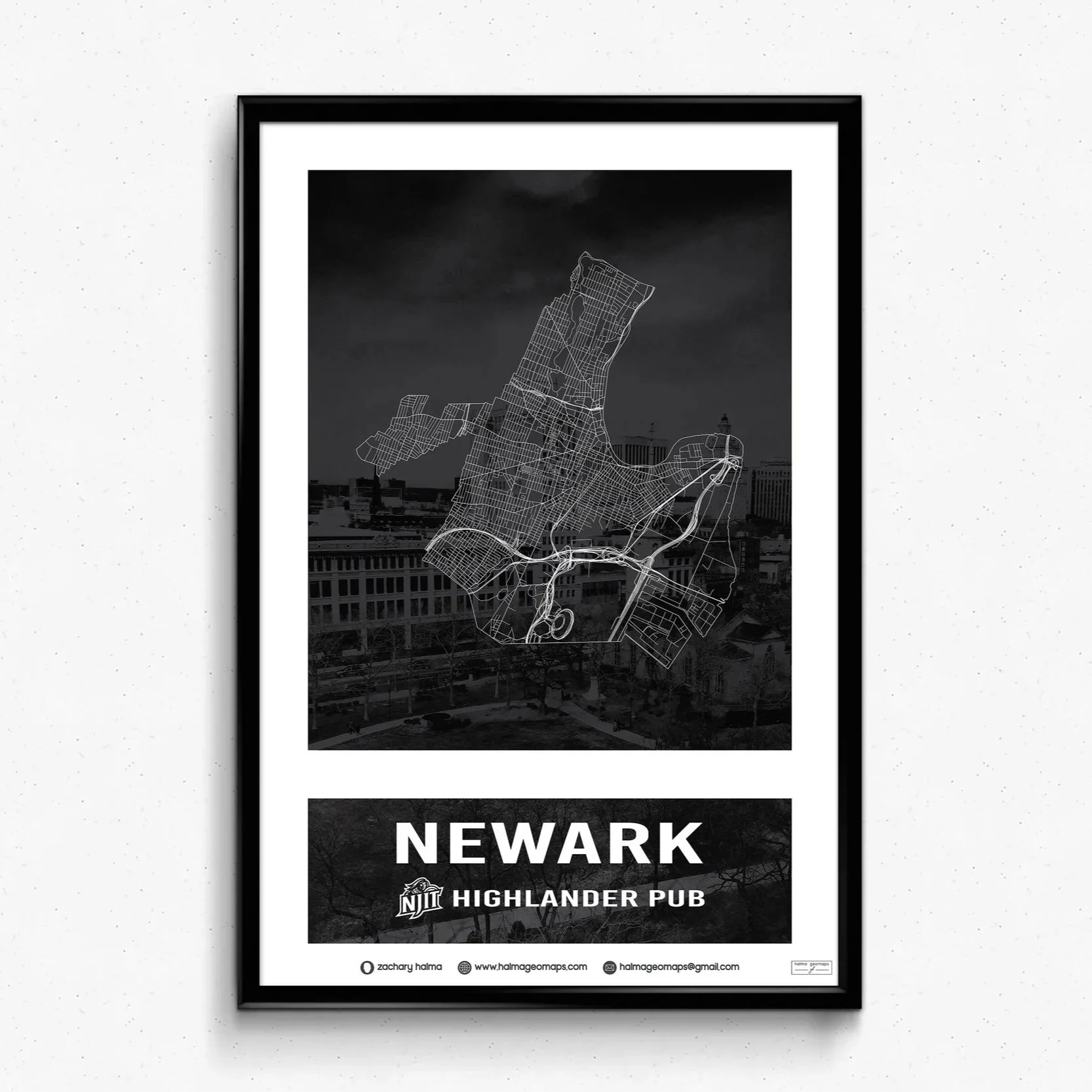 A custom map made for Newark, NJ, which features a photographic skyline background, the NJIT university logo, and the Highlander Pub restaurant name.