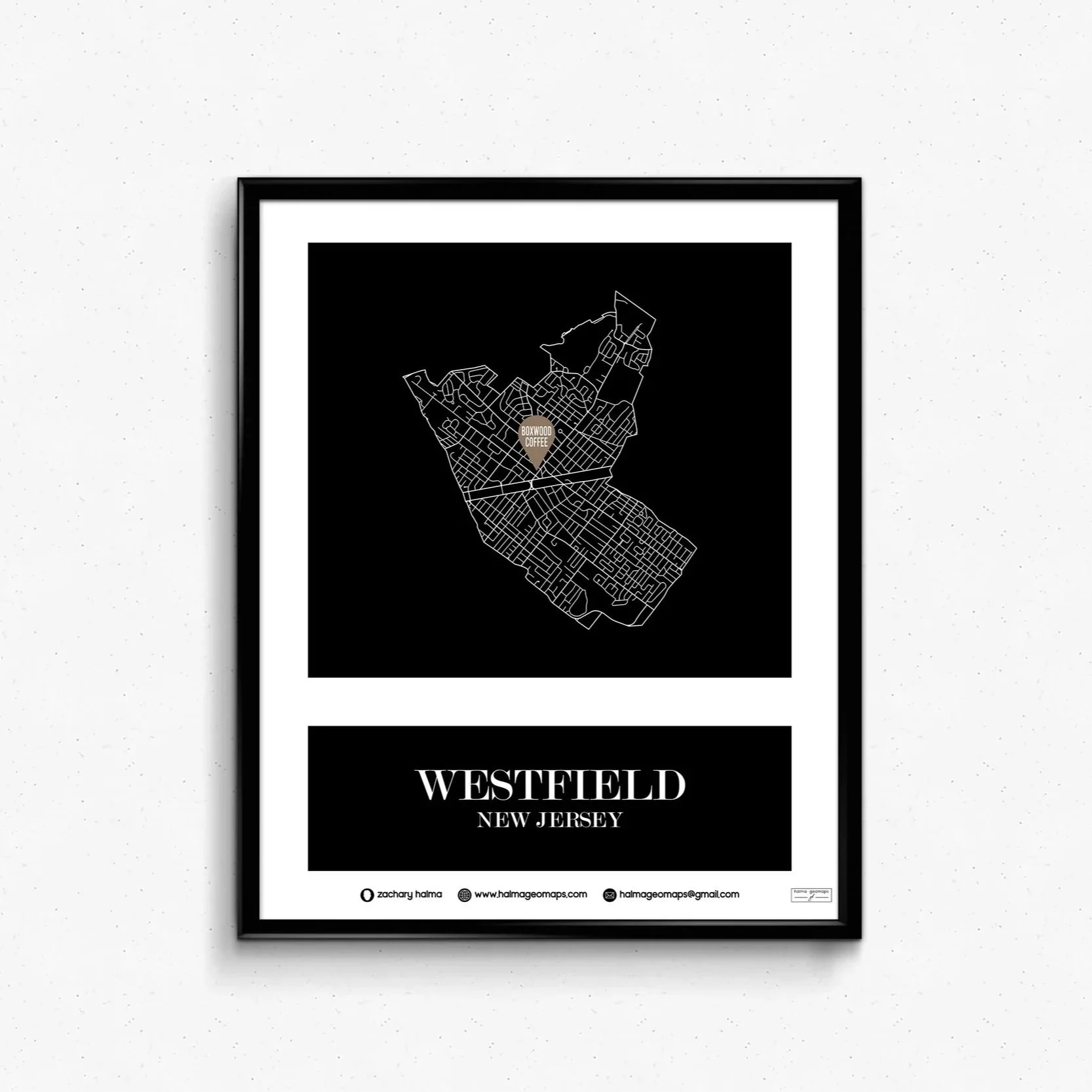 A custom map made for Boxwood Coffee in Westfield, NJ, which features a custom pin marking the café’s location.