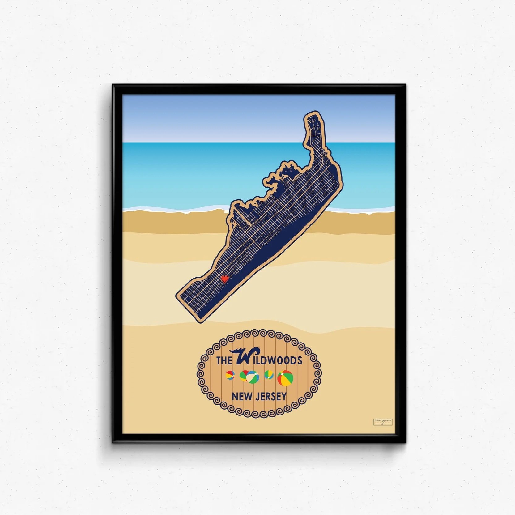 A custom map made for Wildwood, Wildwood Crest, and North Wildwood, NJ, which features a beach illustration in the background, the Wildwood town logo, and a red heart-shaped pin marking a home address.