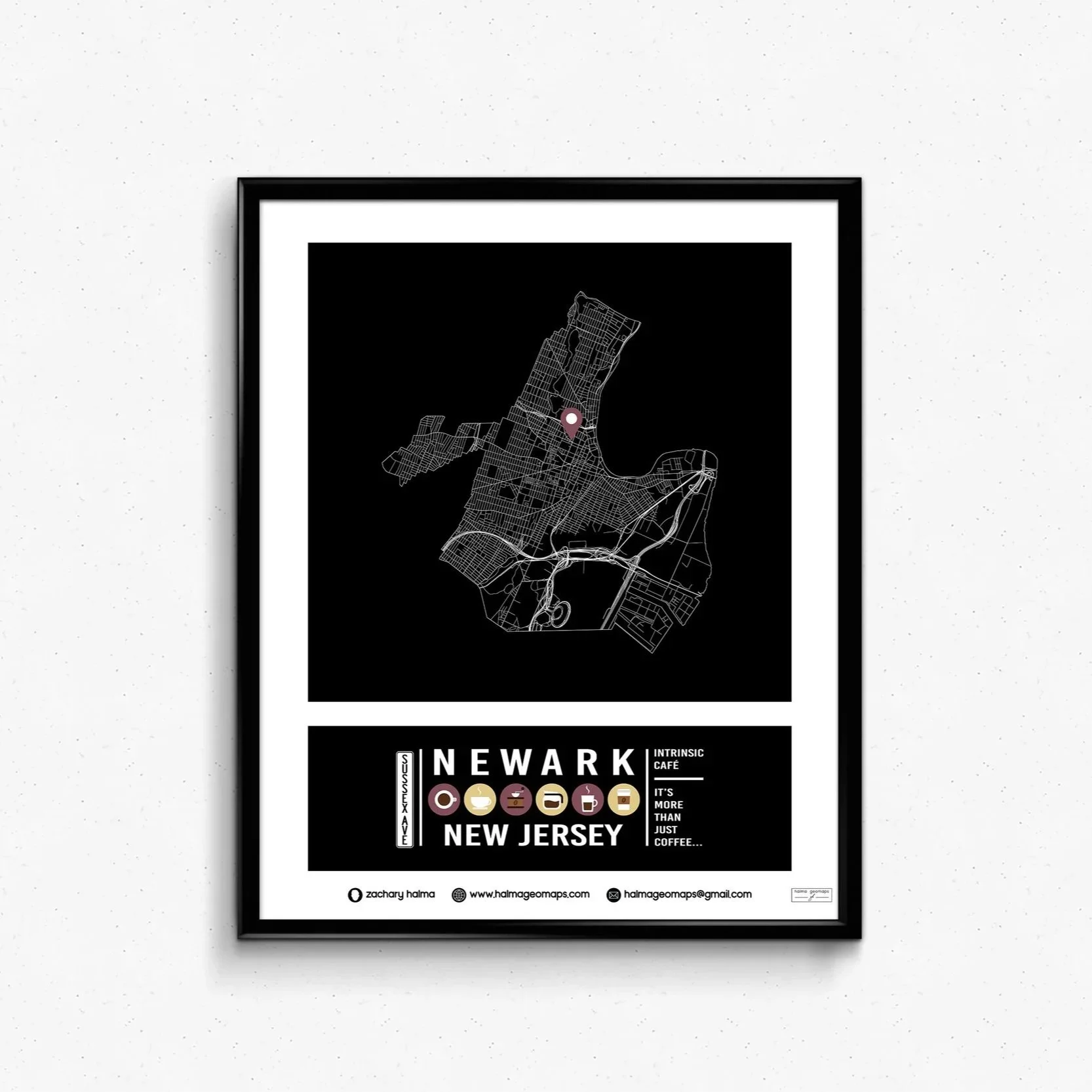 A custom map made for Intrinsic Café in Newark, NJ, which features café-themed vector graphics and a pin marking the café’s location.