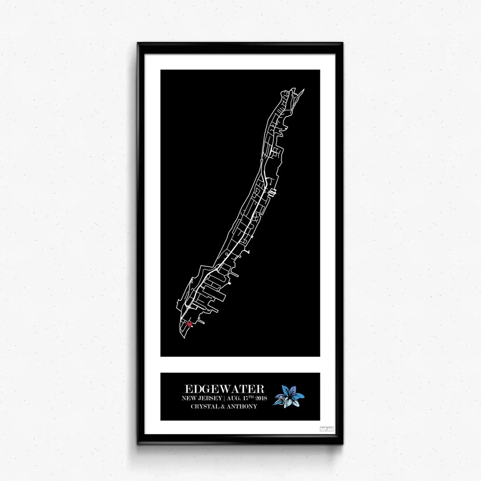 A custom map made for a customer who proposed in Edgewater, NJ, which features a red heart-shaped pin marking the proposal location, the engagement date, and a custom illustration of a blue lily flower with an engagement ring.