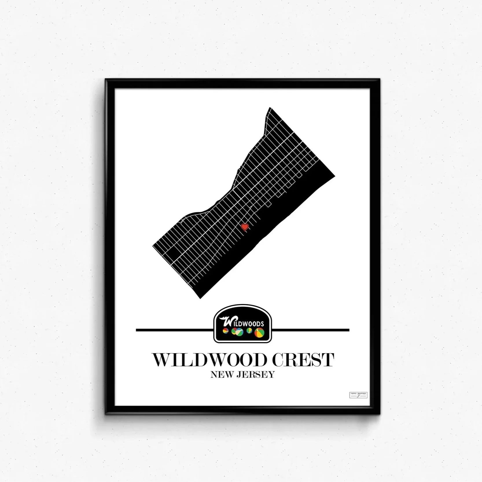 A custom map made for Wildwood Crest, NJ, which features a custom township logo and a red heart-shaped pin marking a home address.