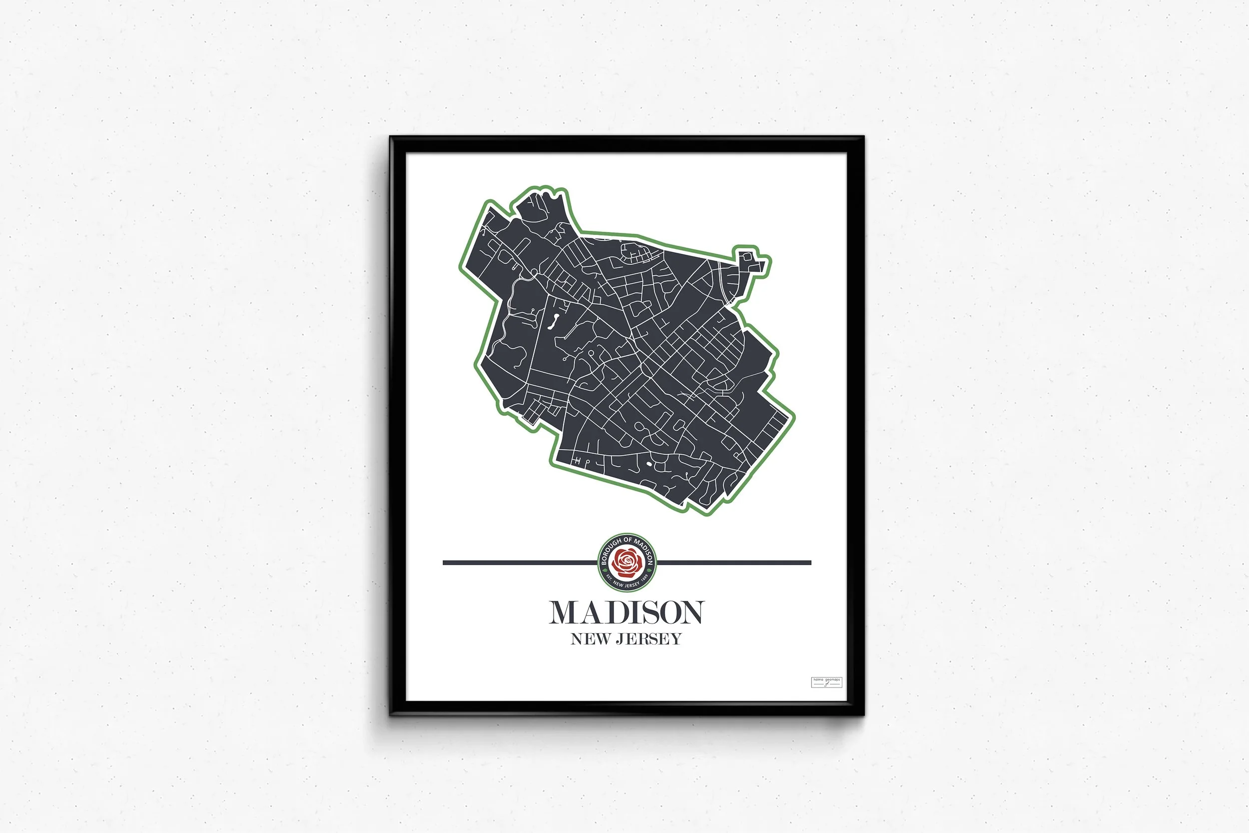 A custom map made for Madison, NJ, which features a green map outline and a red rose vector logo representing Madison’s nickname, the “Rose City.”