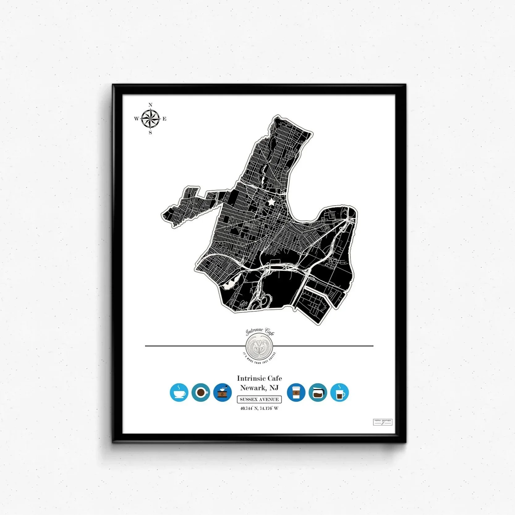 A custom map made for Intrinsic Café in Newark, NJ, which features the official café logo, café-themed vector graphics, a white star-shaped location pin, longitudinal coordinates, and a map compass.